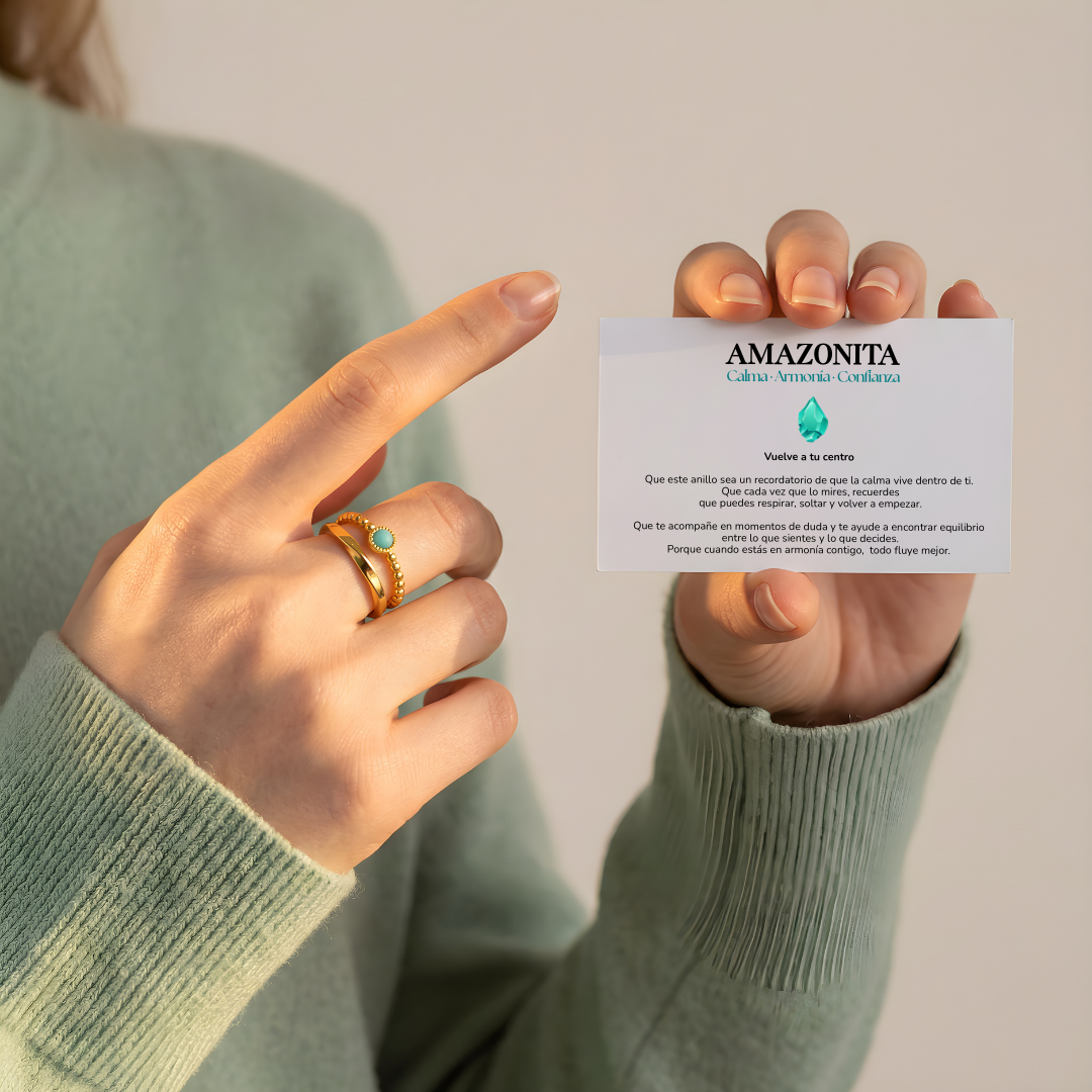 AMAZONITA Calma · Armonía · Confianza Vuelve a tu centro Que este anillo sea un recordatorio de que la calma vive dentro de ti. Que cada vez que lo mires, recuerdes que puedes respirar, soltar y volver a empezar. Que te acompañe en momentos de duda y te ayude a encontrar equilibrio entre lo que sientes y lo que decides. Porque cuando estás en armonía contigo, todo fluye mejor.
