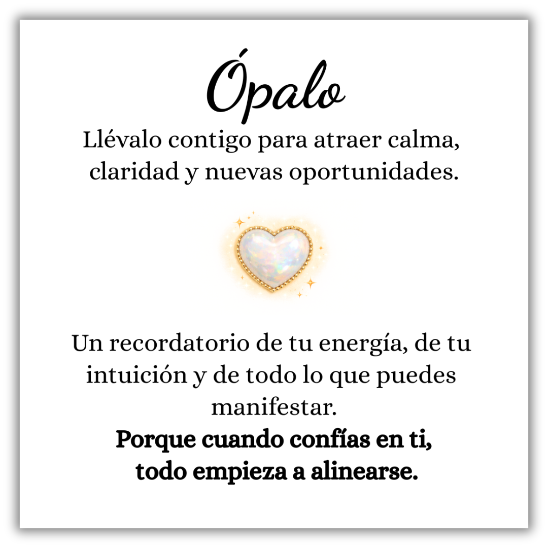 MENSAJE DE LA TARJETA Ópalo Llévalo contigo para atraer calma, claridad y nuevas oportunidades. Un recordatorio de tu energía, de tu intuición y de todo lo que puedes manifestar. Porque cuando confías en ti, todo empieza a alinearse. ESPECIFICACIONES Talla: Ajustable Metal: Acero inoxidable Acabado: Oro de 18K (Libre de Níquel y Barniz) Piedra: Ópalo Resistente al agua Tarjeta con mensaje original GRATIS