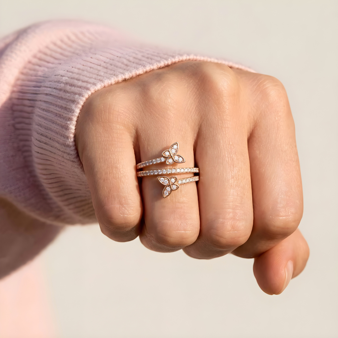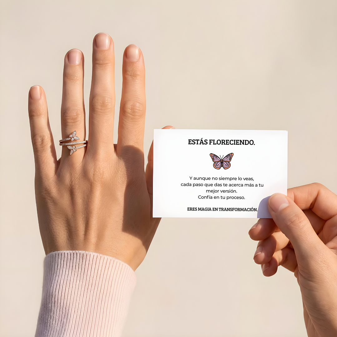 Con su diseño envolvente y mariposas brillantes, este anillo es un recordatorio de que lo más bello en la vida… siempre encuentra la forma de volar.