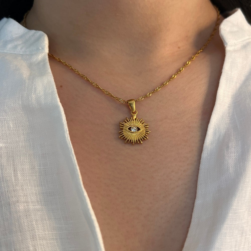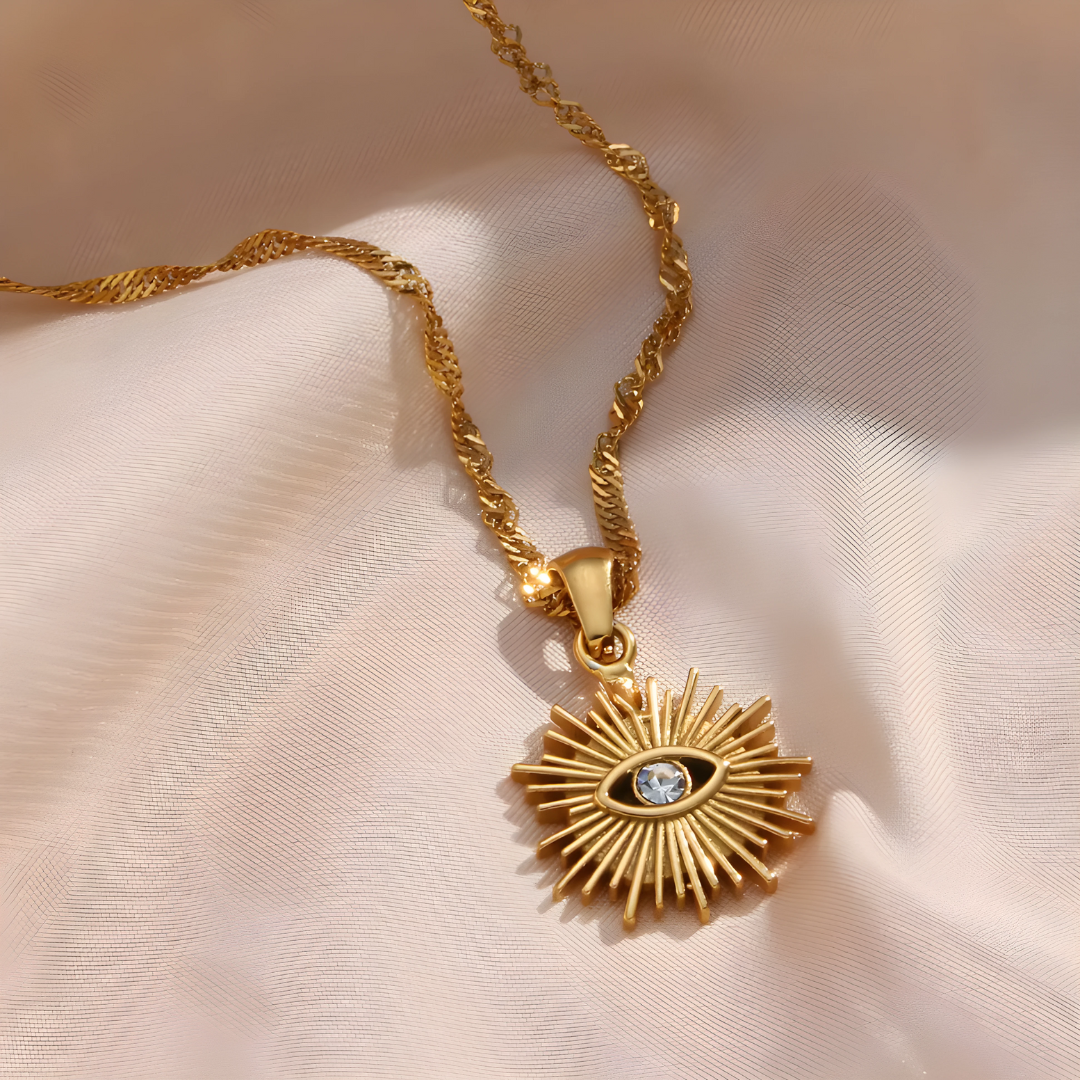 El Collar Boho Protector está inspirado en la sabiduría ancestral del ojo que todo lo ve, un símbolo que resguarda, guía y acompaña tu camino. Su diseño dorado y bohemio combina armonía, intuición y una energía suave que te recuerda que siempre estás rodeada de luz, incluso en los días más inciertos. Cada detalle del colgante representa claridad y propósito interior. Es una pieza creada para quienes desean caminar con intención, atraer buenas energías y mantener su espacio interior protegido de lo que no resuena con su paz. Más que una joya, es un amuleto moderno: un recordatorio de que tu intuición es tu mayor guía y de que tu energía merece ser cuidada, honrada y protegida.