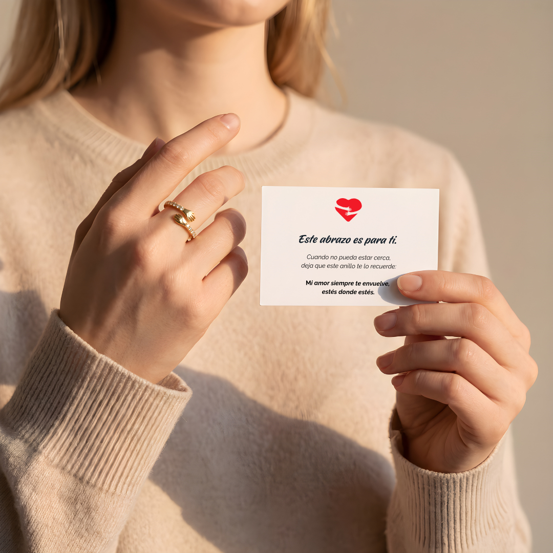MENSAJE DE LA TARJETA Este abrazo es para ti. Cuando no pueda estar cerca, deja que este anillo te lo recuerde: mi amor siempre te envuelve, estés donde estés.