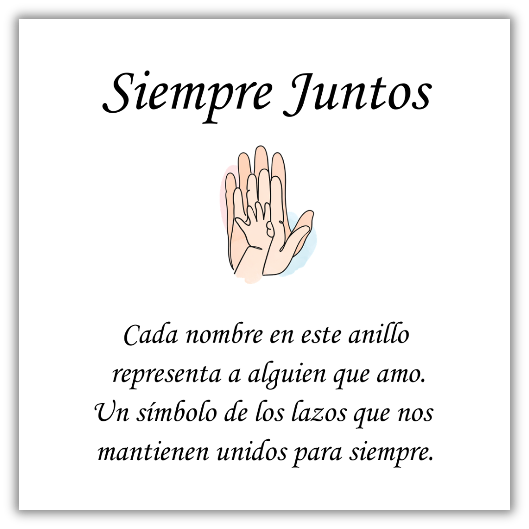 Incluye tarjeta con mensaje y caja de regalo gratuita. MENSAJE DE LA TARJETA Siempre Juntos Cada nombre en este anillo representa a alguien que amo. Un símbolo de los lazos que nos mantienen unidos para siempre.