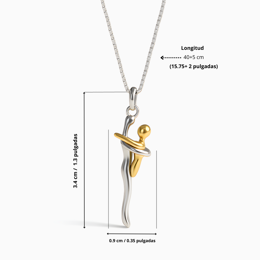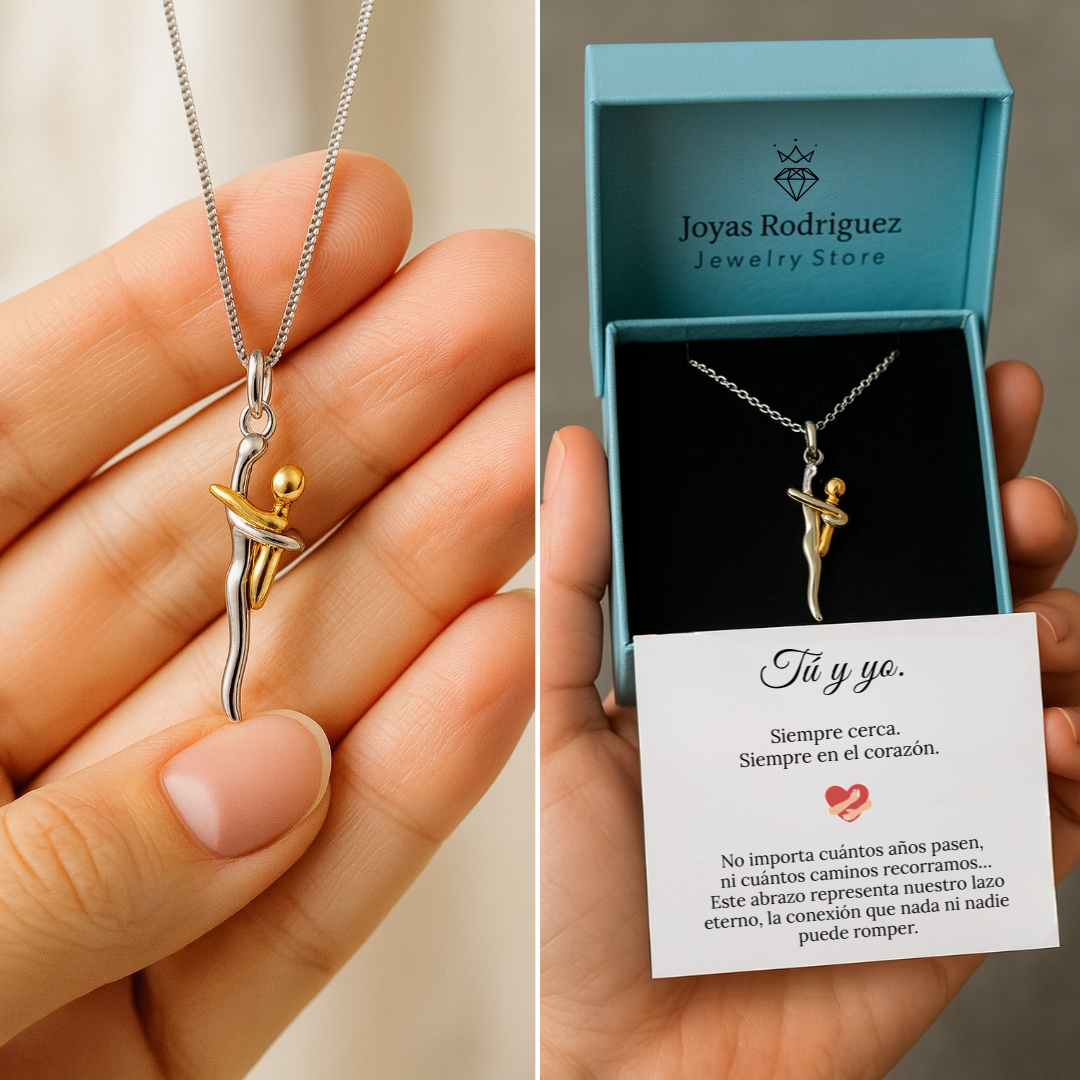 Hay abrazos que no se olvidan. Este collar captura ese instante de conexión pura, donde dos almas se funden en un solo latido. Un símbolo de amor eterno, de presencia constante, incluso en la distancia.