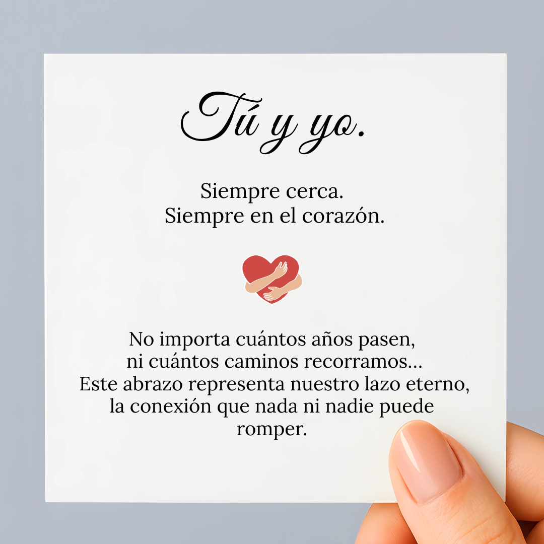 MENSAJE DE LA TARJETA Tú y yo. Siempre cerca. Siempre en el corazón. No importa cuántos años pasen, ni cuántos caminos recorramos… Este abrazo representa nuestro lazo eterno, la conexión que nada ni nadie puede romper.
