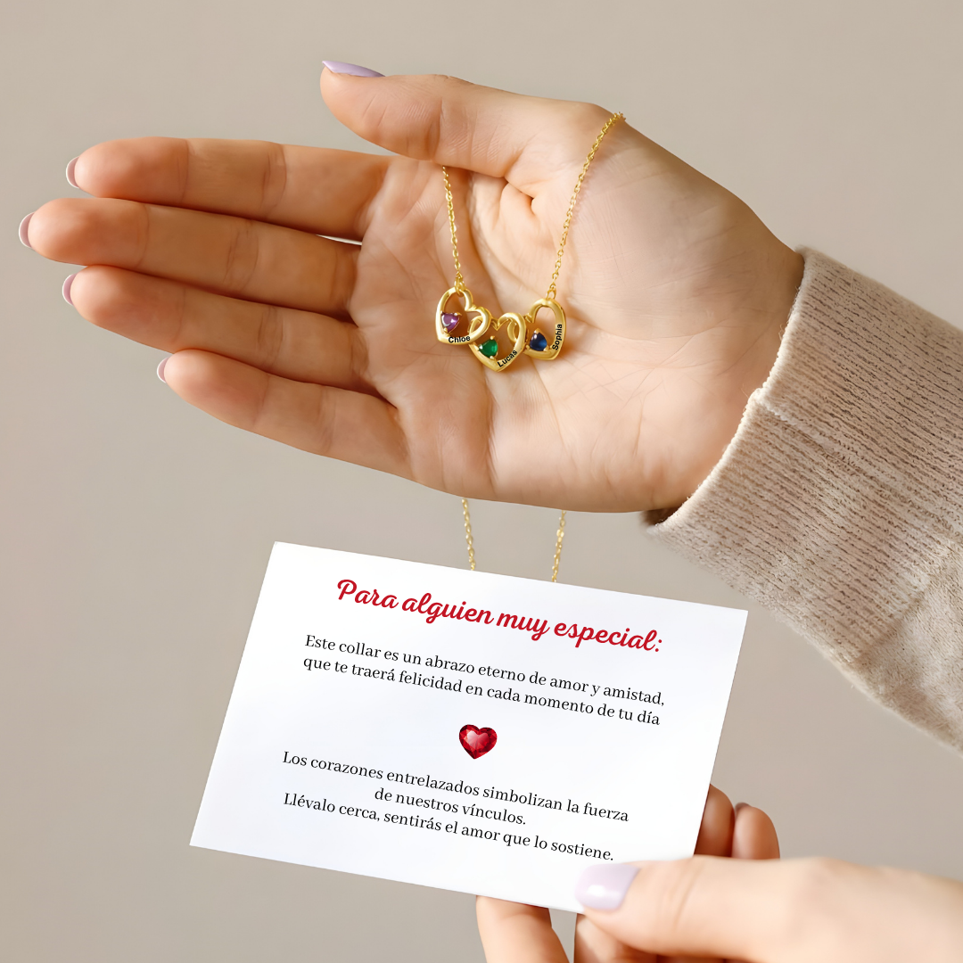 Incluye tarjeta con mensaje y caja de joyería GRATIS MENSAJE DE LA TARJETA Para alguien muy especial: Este collar es un abrazo eterno de amor y amistad, que te traerá felicidad en cada momento de tu día. Los corazones entrelazados simbolizan la fuerza de nuestros vínculos. Llévalo cerca, sentirás el amor que lo sostiene.