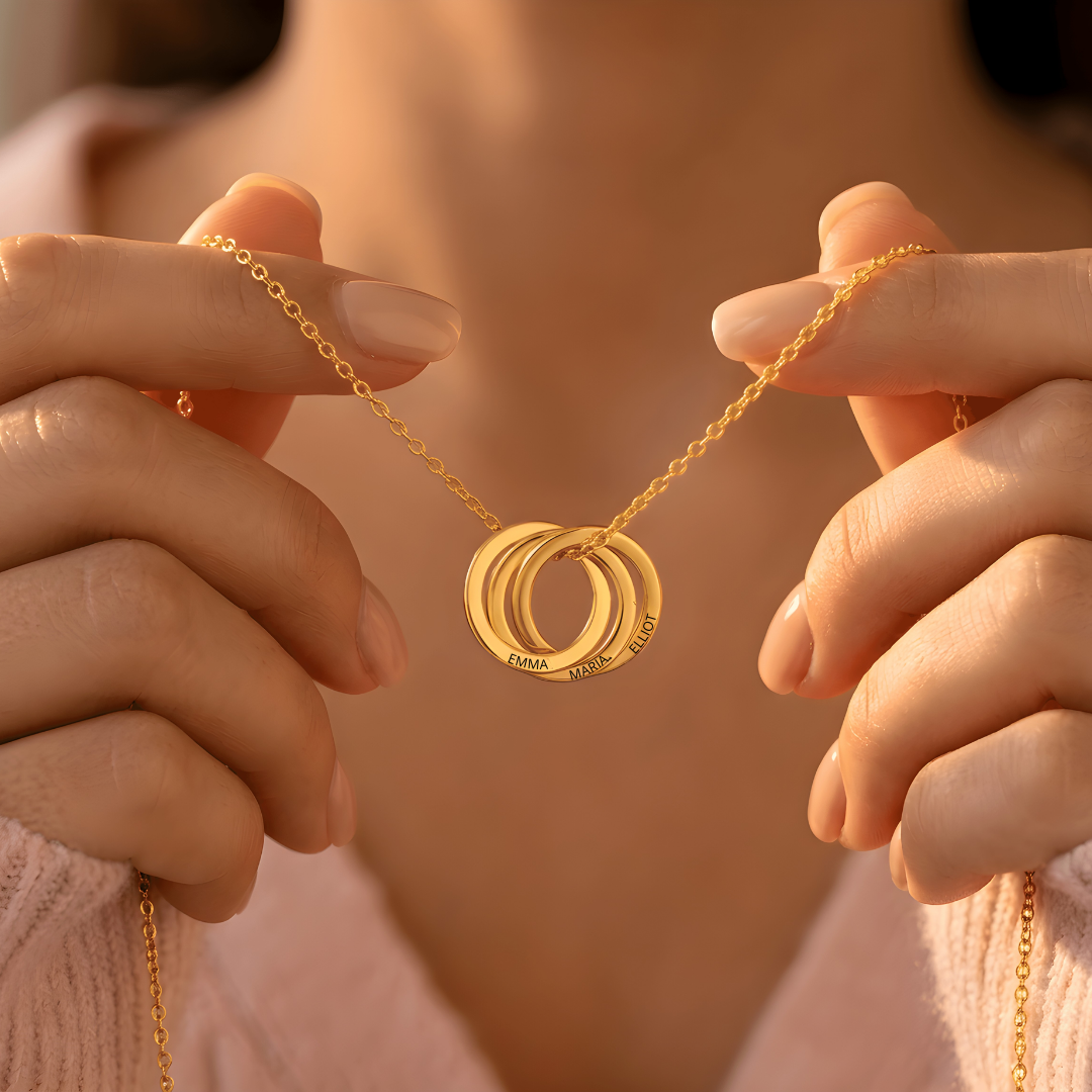 Se puede personalizar con delicados aros entrelazados, y en cada aro puedes grabar un nombre, creando una joya única que representa a cada uno de sus grandes amores.