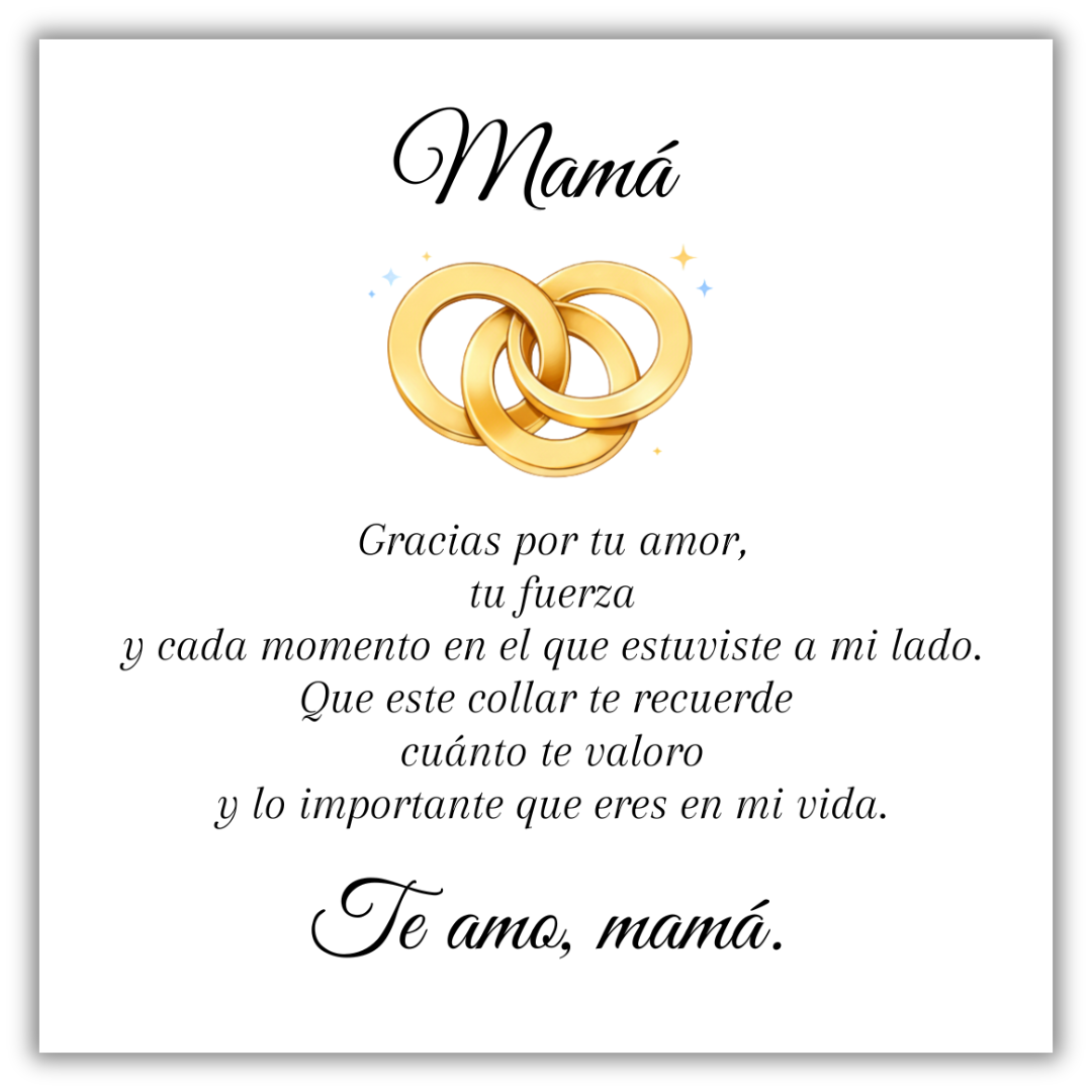 Cada joya incluye su tarjeta con mensaje y su cajita de regalo, cuidadosamente empaquetadas y listas para sorprender.